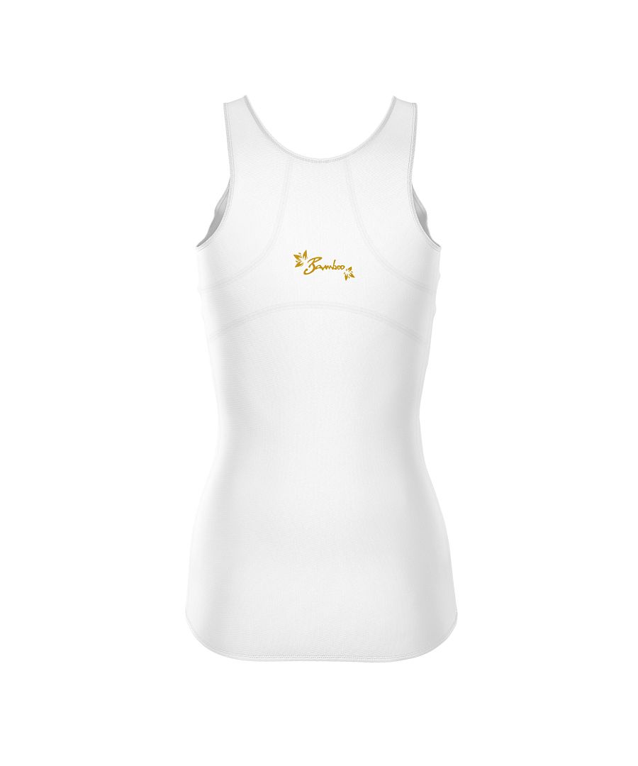 Dámské funkční triko bez rukávů bílé barvy s plochými švy a zlatým potiskem. Vhodné pro sport i běžné nošení.