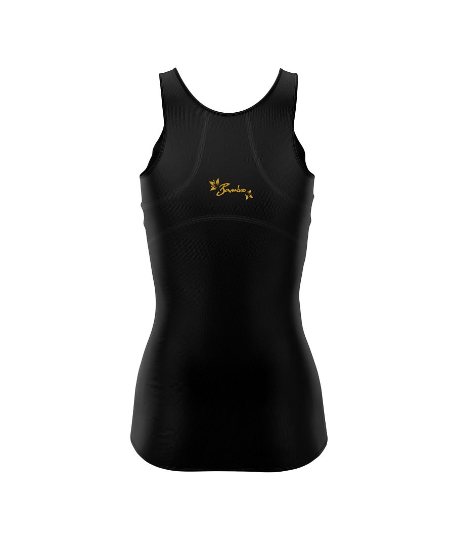 Dámské funkční triko bez rukávů černé barvy s plochými švy a zlatým potiskem. Vhodné pro sport i běžné nošení.