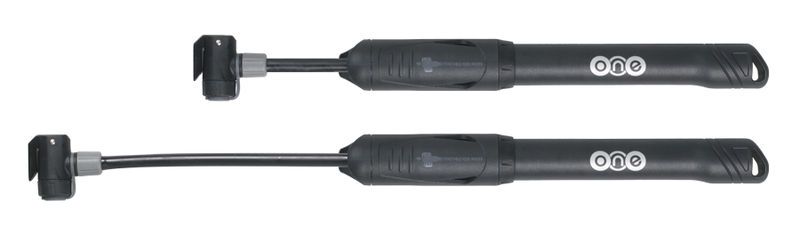 Ruční plastová cestovní pumpička na jízdní kolo s výsuvnou 150 mm hadičkou s hlavicí s použitím na oba typy ventilků AV, FV (po otočení gumičky v hlavě).