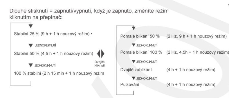- Režimy svícení i blikání se mění krátkým stiskem tlačítka, pro přechod z režimu svícení do režimu blikání použijte dvojitý stisk tlačítka