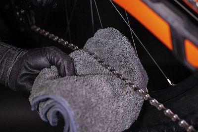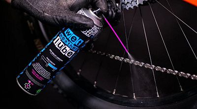4. Nastříkejte malé množství MUC-OFF Wet Weather Lube na vnitřní stranu článků řetězu a přitom pohybujte pedály směrem vzad.