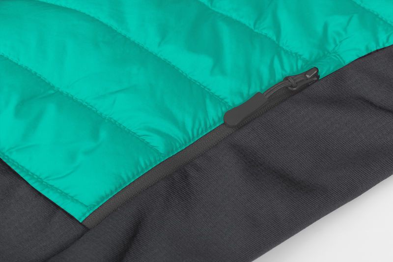 Funkční elastický materiál z polyesterových mikrovláken SuperDryntex se zateplením tvoří spodní část rukávů a boční panely.