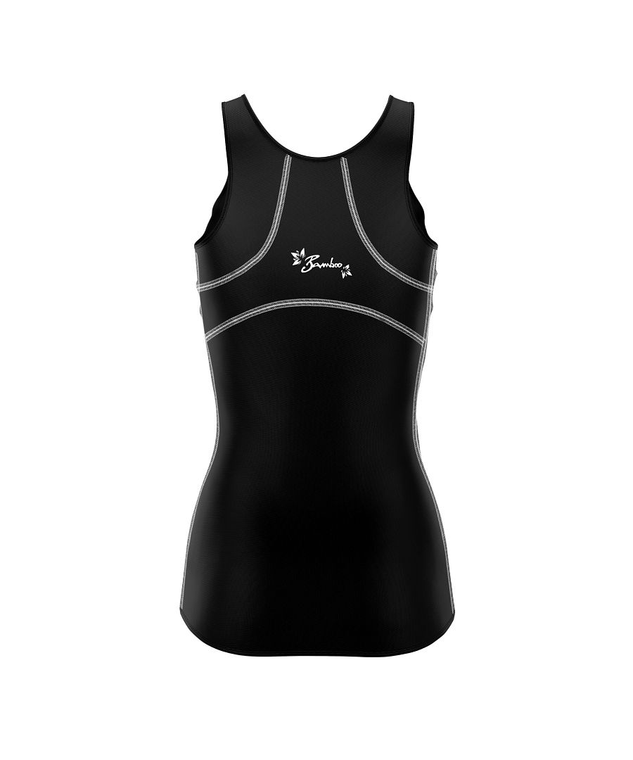 Dámské funkční triko bez rukávů černé barvy s plochými švy a bílým potiskem. Vhodné pro sport i běžné nošení.