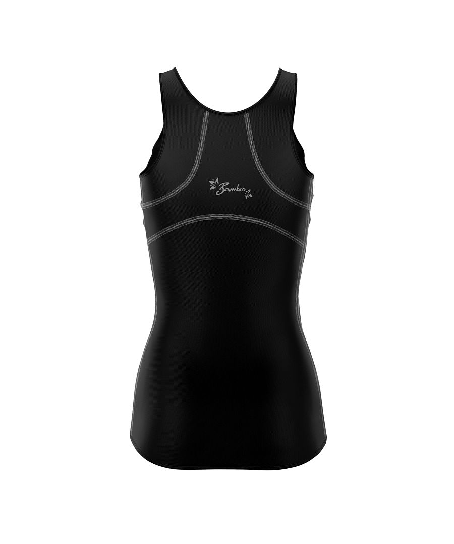 Dámské funkční triko bez rukávů černé barvy s plochými švy a šedým potiskem. Vhodné pro sport i běžné nošení. Z vysoce kvalitních bambusových vláken, které mají vynikající antibakteriální vlastnosti.