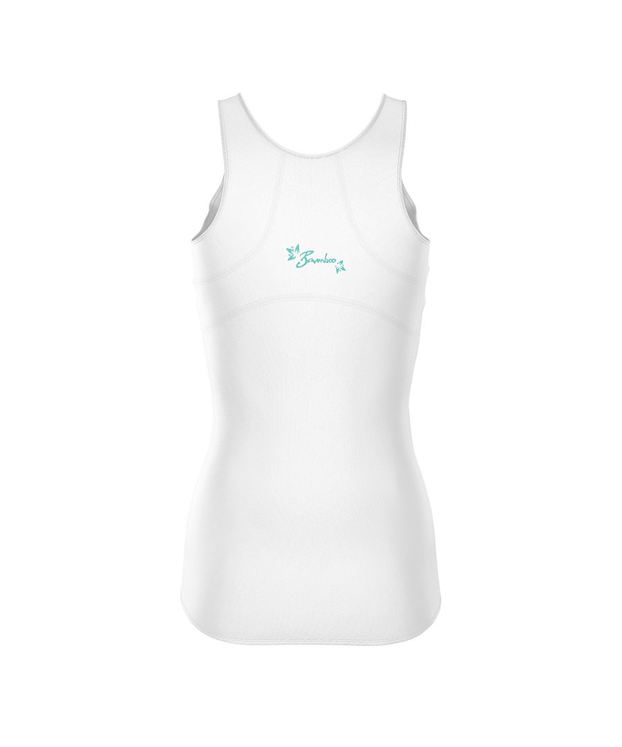 Dámské funkční triko bez rukávů bílé barvy s plochými švy a modrým potiskem. Vhodné pro sport i běžné nošení. Z vysoce kvalitních bambusových vláken, které mají vynikající antibakteriální vlastnosti.